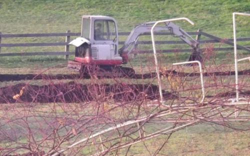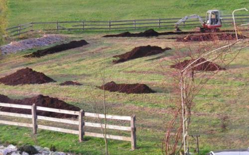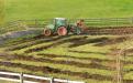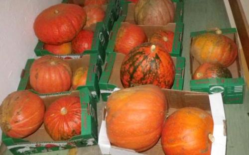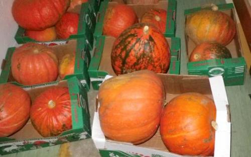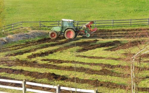 Slike prikazujejo navoz komposta v ekovrtu, pridelek buč in oranje.