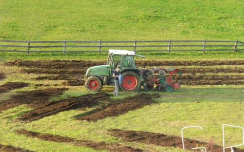 Slike prikazujejo navoz komposta v ekovrtu, pridelek buč in oranje.